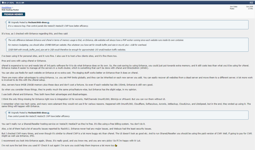 Despite its advantages, some users expressed concerns about Enhance being developed by a hosting provider, potentially leading to conflicts of interest. Additionally, Enhance’s use of Docker has been criticized for making it more resource-intensive compared to other control panels.